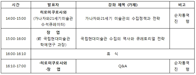 일본 가나자와 21세기미술관, 국립현대미술관 등 세계적인 미술기관의 수집 연구 전문가들이 참석해 현대미술의 주요 이슈중 하나인 수집의 의미와 역할, 정책 및 방법론을 집중 강연합니다